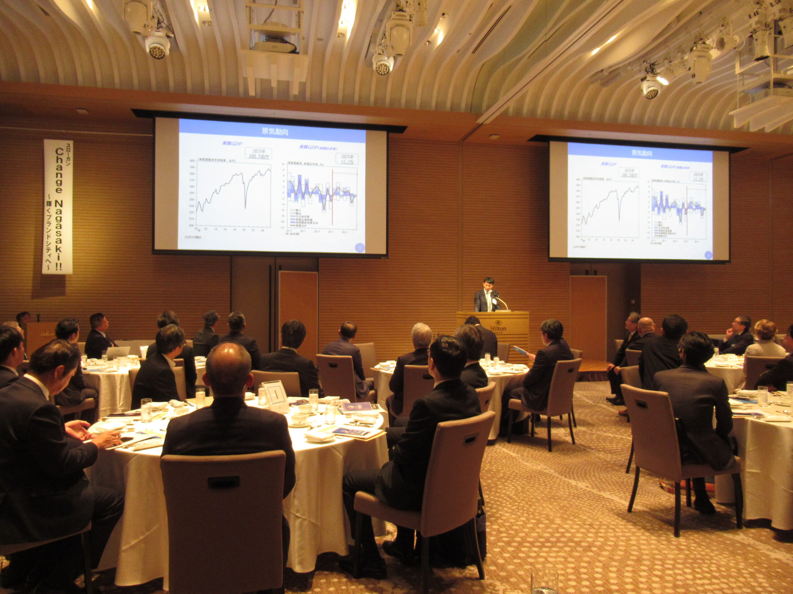 講演では、全国経済の動向を踏まえながら、長崎県内の生産、設備投資、個人消費、観光、企業収益、雇用情勢などについて最新のデータをもとに解説がありました。特に、観光需要の回復や企業収益の改善が見られる一方で、人手不足や物価上昇への対応、賃上げの持続などが今後の重要な課題として指摘されました。また、国内外の経済環境や金融政策の動向を踏まえつつ、地域経済の持続的成長に向けた企業の投資や人材確保の重要性について説明がありました。